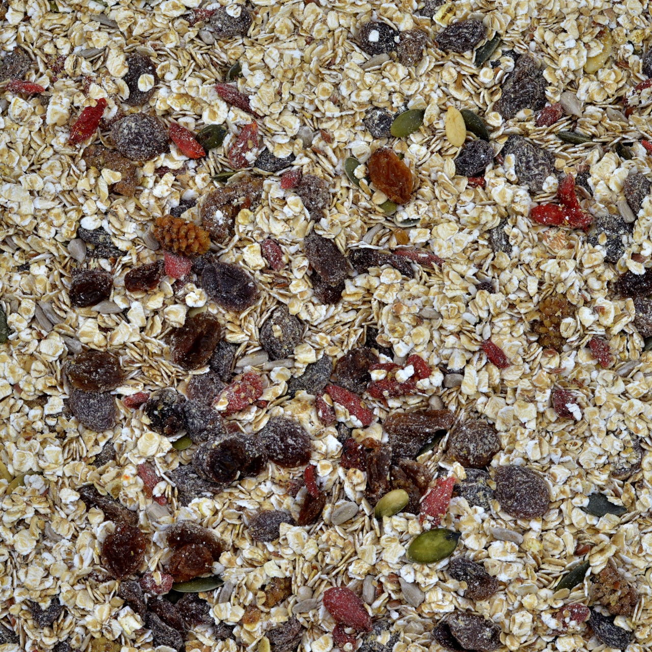 | Ingrediënten | havermout, rozijnen, zonnebloempitten, pompoenpitten, goji bessen, moerbei bessen, gebroken lijnzaad |