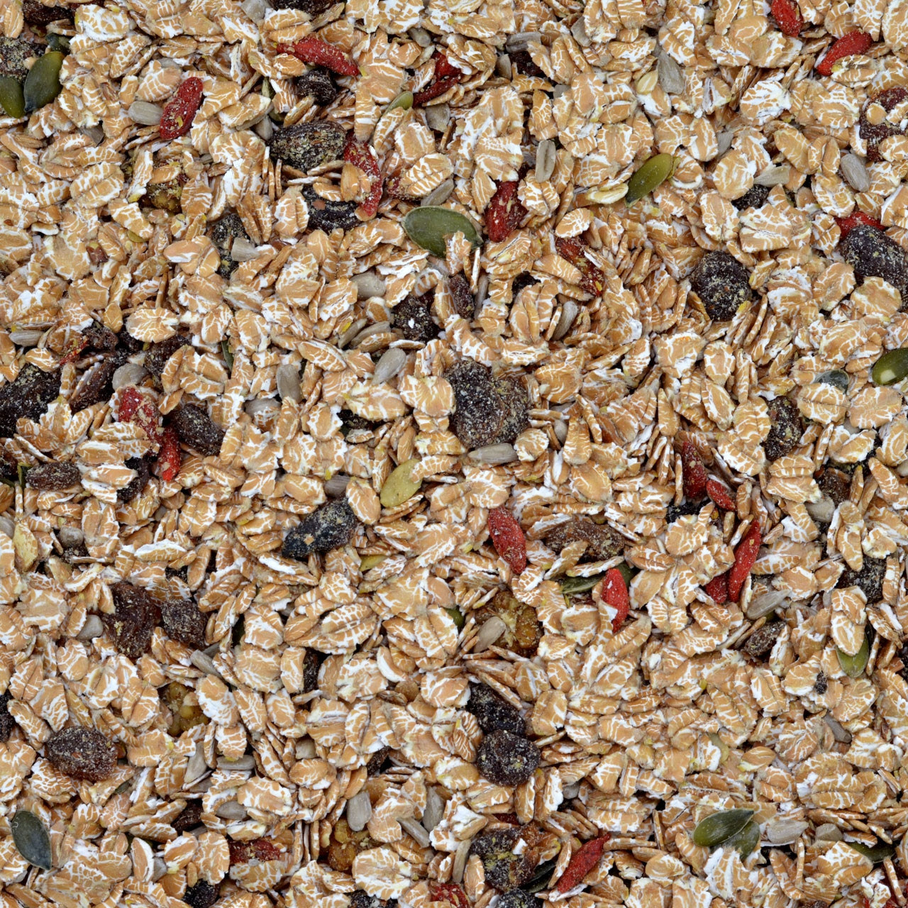 | Ingrediënten | speltvlokken, rozijnen, goji bessen, moerbeibessen, pompoenpitten, zonnebloempitten, gebroken lijnzaad |