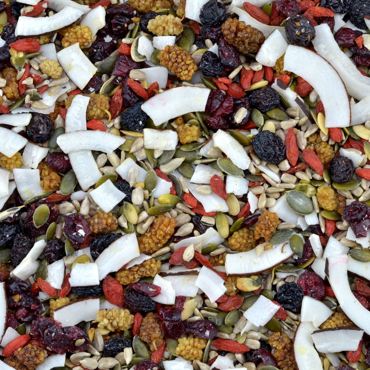 Ingrediëntengedroogde cranberries, goji bessen, moerbeibessen, rozijnen, zonnebloempitten, pompoenpitten